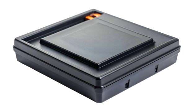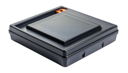 Black square device with inset panel and orange accent, viewed from an angle
