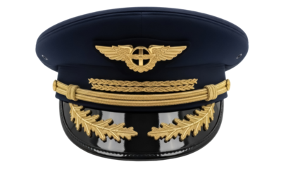Military air force officer visor cap with gold insignia and wings isolated on transparent background