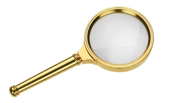 Golden magnifying glass with textured grip handle and clear lens for detailed inspection and analysis, isolated on a transparent background