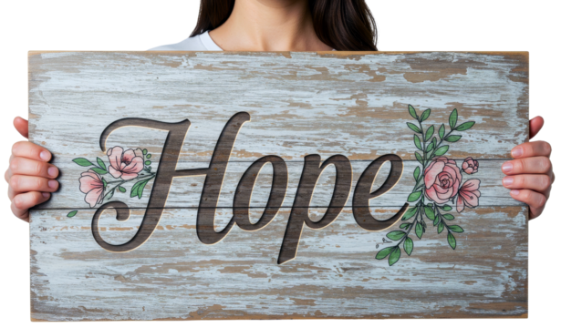 Woman holding a rustic wooden sign with the word Hope and floral decorations in soft colors, isolated on transparent background