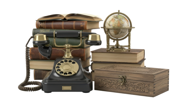 Front view of a vintage inspired rotary dial telephone and other decor items on a table isolated on white background