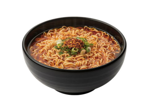 Spicy instant noodle bowl with green onions and chili flakes isolated on transparent background