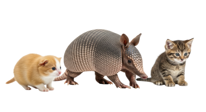 Close-up of a hamster, armadillo, and kitten on a white background, curious animals gathering together, perfect for educational and pet-related projects