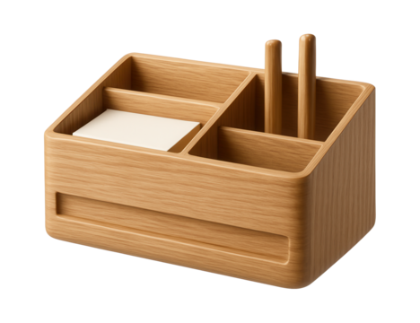 Wooden stationery box with divided sections for organizing notepads, sticky notes, and writing instruments on a living room side table.