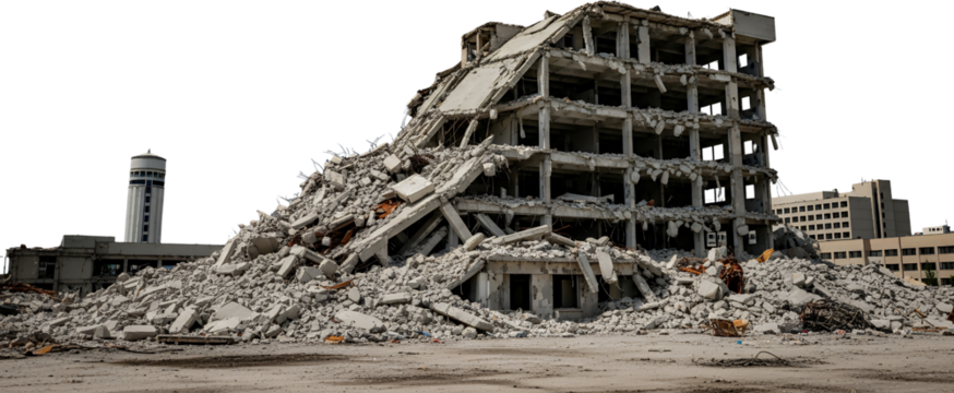 Ruined concrete building debris pile with intact tower and modern structures in background destruction demolition collapse