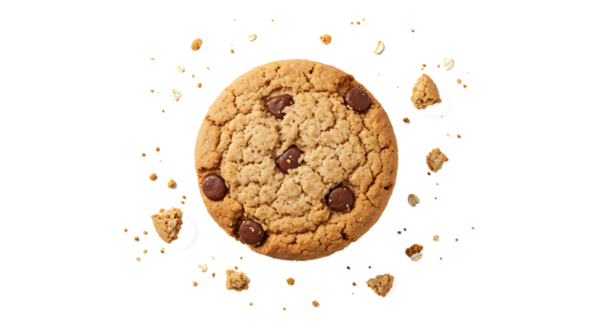 Crumbs integral wholewheat biscuit with oatmeal and chocolate, cookie flying, isolated on white, top view, clipping path