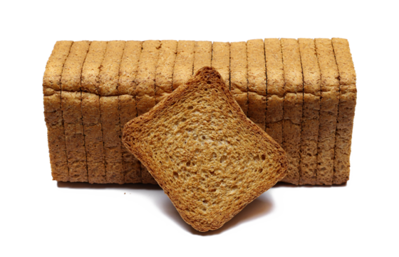 Pile rusks with wholewheat flour, sliced whole wheat dry rusk bread isolated on white background, side view