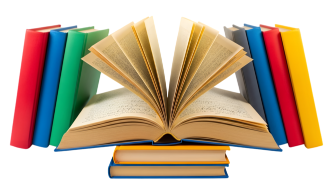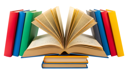 Open book with colorful books in a row, isolated on transparent background