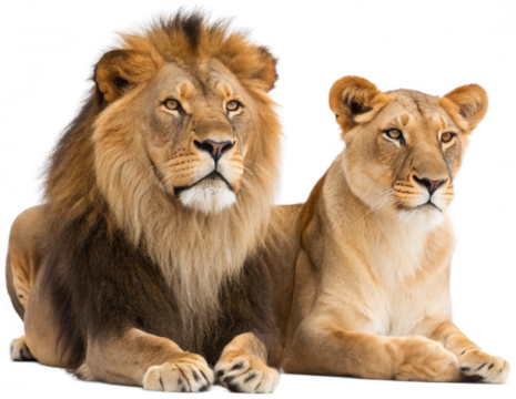 Majestic and powerful African lions, a male with a full mane and a female with a lighter coat, are depicted in a relaxed, side-by-side pose with intense gazes,, isolated on transparent background.