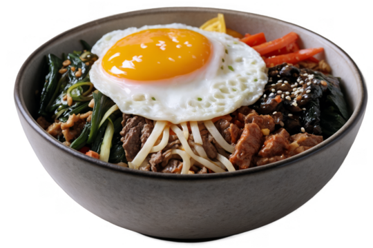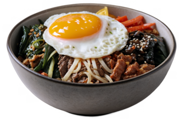 Traditional Korean bibimbap in a bowl topped with a sunny-side-up egg, png, isolated on a white background