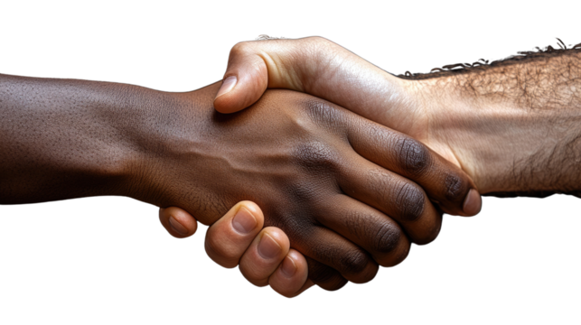 A Handshake of Unity: Two hands, one dark and one light, clasp together in a powerful symbol of unity and shared purpose.  The image portrays a sense of collaboration and shared understanding.