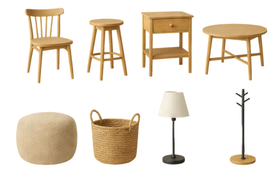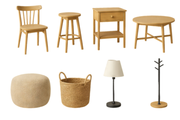 Png set of miniature furniture collection with chair, stool, table, lamp, and basket isolated on transparent background. concept of interior decor, home accessories, decor ideas.