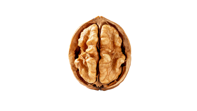 A close-up view of a halved walnut revealing its brain-like interior structure against a white background.