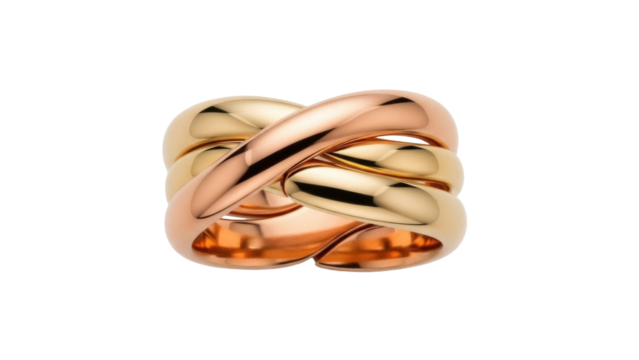 Isolated interlaced tricolor ring, elegant intertwined golden and rose gold bands, shiny object