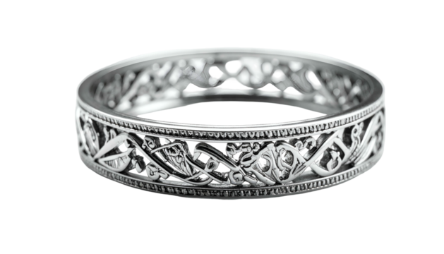Silver ring with intricate, detailed Celtic knotwork design, on a black background