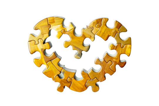Isolated wooden heart-shaped puzzle on transparent background, symbolizing beautiful complexity of diversity. Each distinct piece represents unique individuals in harmonious society