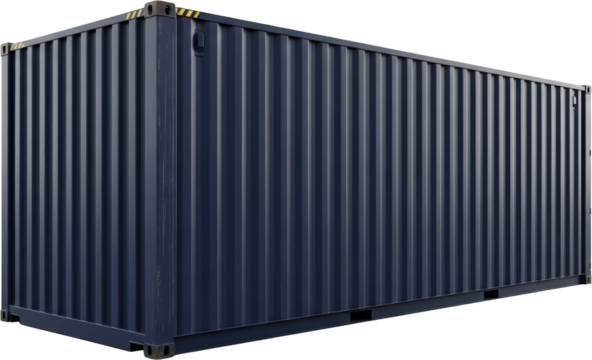 A detailed perspective view of a standard shipping container isolated on transparent background