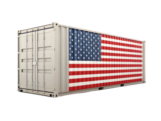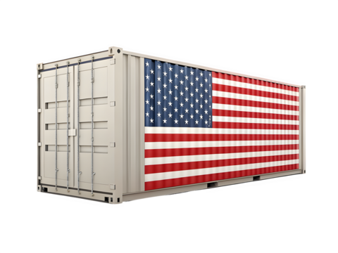 White shipping container decorated with american flag isolated on transparent background