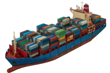 Large blue container ship loaded with numerous colorful shipping containers, isolated against a solid transparent background, ready for global transport. background removed