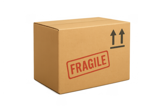 Cardboard shipping box with fragile warning sign and arrows, indicating careful handling and delivery, transparent background