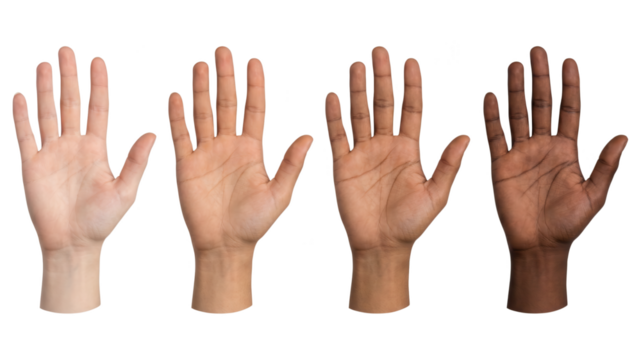Open hands of different ethnicity. Diverse hands gesturing against white.