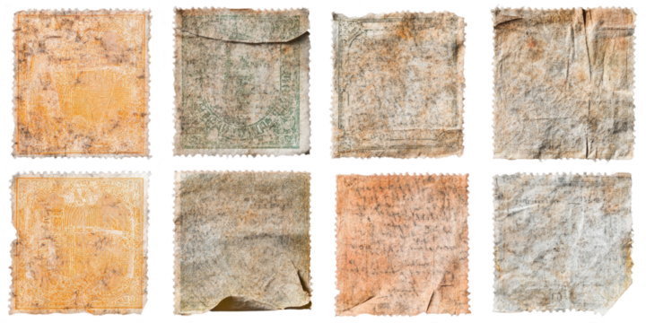 Collection of vintage postage stamps showcasing worn edges and faded designs from different countries and decades