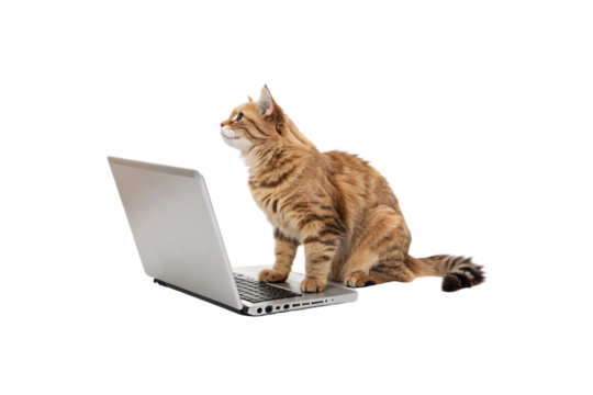 A tabby cat perches on a laptop, staring upward inquisitively. The contrast between its small size and the laptop adds a humorous charm to the image, isolated on a transparent background