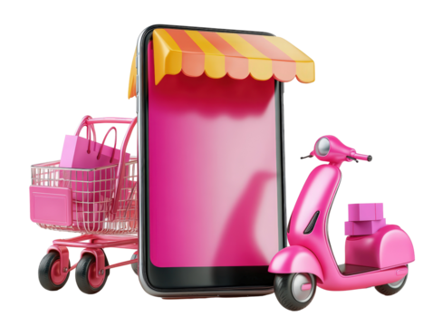 Isolated Pink Online Shopping Concept with Phone, Cart and Scooter