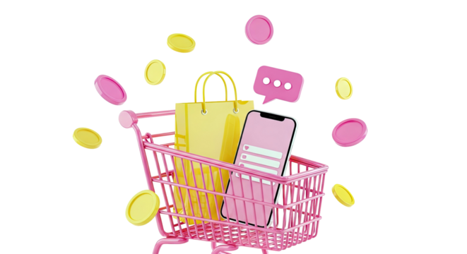 Online Shopping Cart with Phone, Shopping Bag, Coins, and Chat Icon