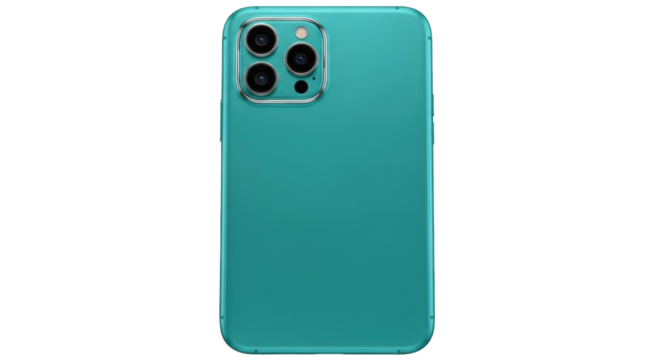 Isolated modern turquoise mobile telephone with triple lens camera for connection use
