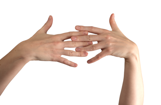 Female hands elegantly intertwined, nails polished and well-groomed, showcasing beauty, skincare, and wellness. Symbolizing self-care, hygiene, and feminine elegance. Isolated on white background.