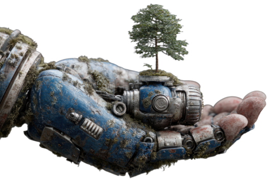 A metallic, weathered hand cradles a small tree, with moss and vines intertwining