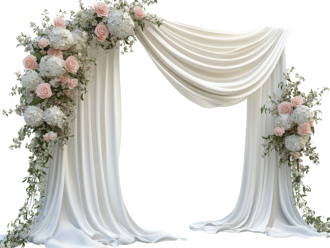 Elegant floral wedding arch with draped fabric and soft pastel flowers for ceremonies.