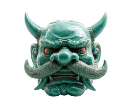 Traditional guardian deity mask green ceramic fierce expression large mustache horned Asian art isolated cultural sculpture intimidating detailed craftsmanship