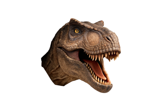 Detailed T-Rex dinosaur head portrait, brown reptilian skin texture with amber eyes and intimidating sharp teeth, isolated on a transparent background