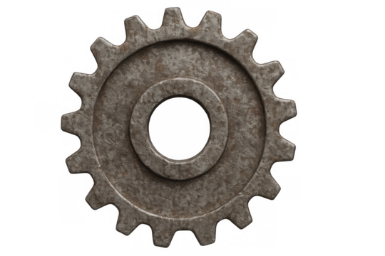 Rusty metal gear spinning, highlighting mechanical intricacy against transparent backdrop, signaling industrial design concept