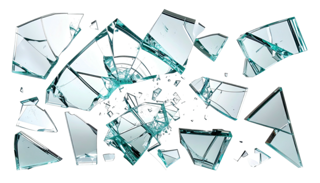 Transparent, shattered glass fragments, isolated on black background, showcasing intricate cracks