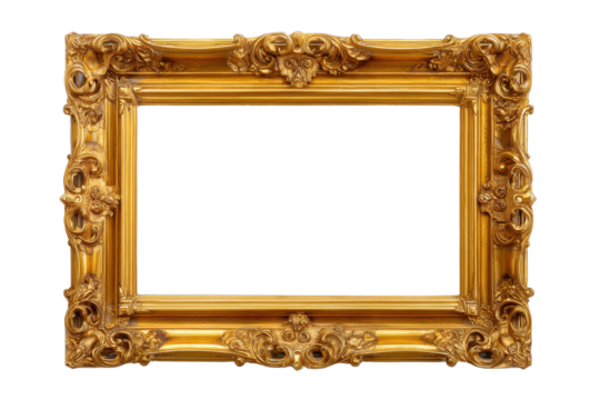 Vintage gold picture frame with intricate baroque details on transparent backdrop