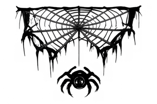 Spider and cobweb creating creepy halloween decoration, intricate network with hanging tattered silk, transparent background