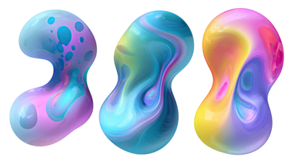 Abstract, colorful, organic forms. Three smooth,  bean-shaped forms with vibrant,  liquid-like patterns.  A spectrum of colors including  purples, pinks,  blues, and yellows.