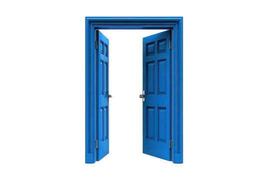 An intriguing blue doorway stands open, inviting exploration into the unknown on a bright day isolated on transparent background