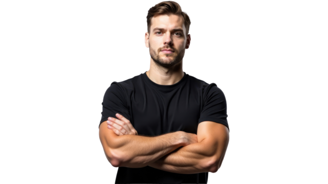 A man standing with his arms crossed wearing a black shirt, suitable for use as a silhouette or to represent an individual
