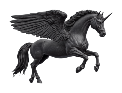 Majestic winged unicorn with detailed feathers and horn in mid-gallop, cut out - stock png.
