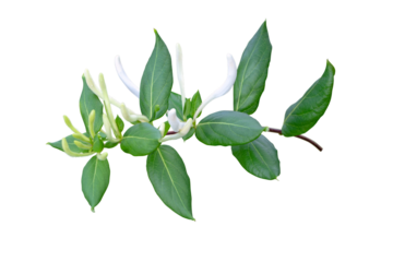Honeysuckle or Lonicera japonica flowering branch isolated transparent png. White fragrant Lonicera flower buds bunch.