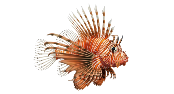 Isolated Lionfish swimming with elegant fins, venomous spines, vibrant colors and patterns