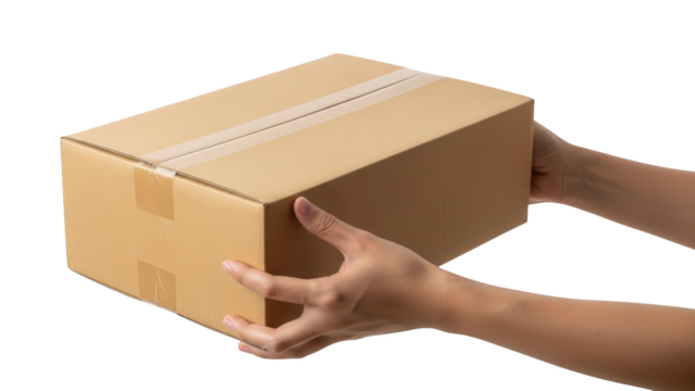 Hands holding and transferring a large brown cardboard box with packing tape on a white background view