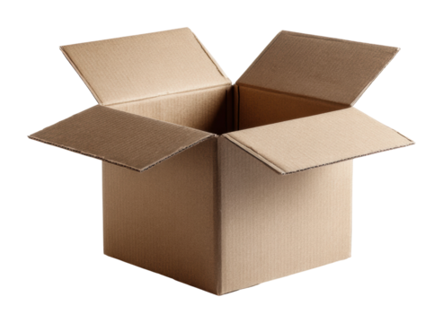 An empty, open brown cardboard box with all flaps extended, ready for packing or storageisolated on transparent background, png