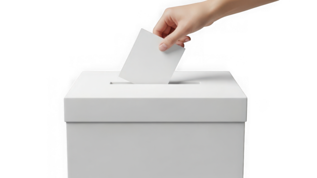 Cute fluffy white rabbit holding a red sign with black text saying vote today on a white background