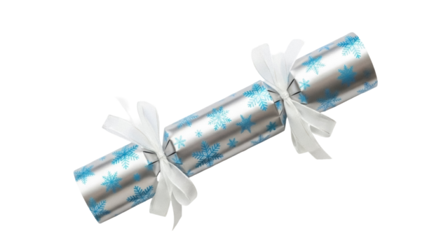 Silver Christmas cracker with blue snowflakes isolated PNG, festive party favor for holiday celebrations and seasonal decorations