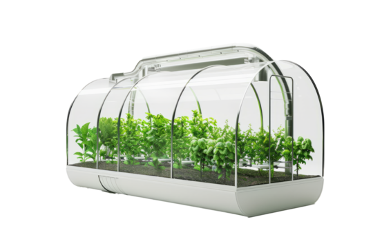 A high-tech greenhouse model with plants growing inside, demonstrating vertical farming innovation, on a white background.